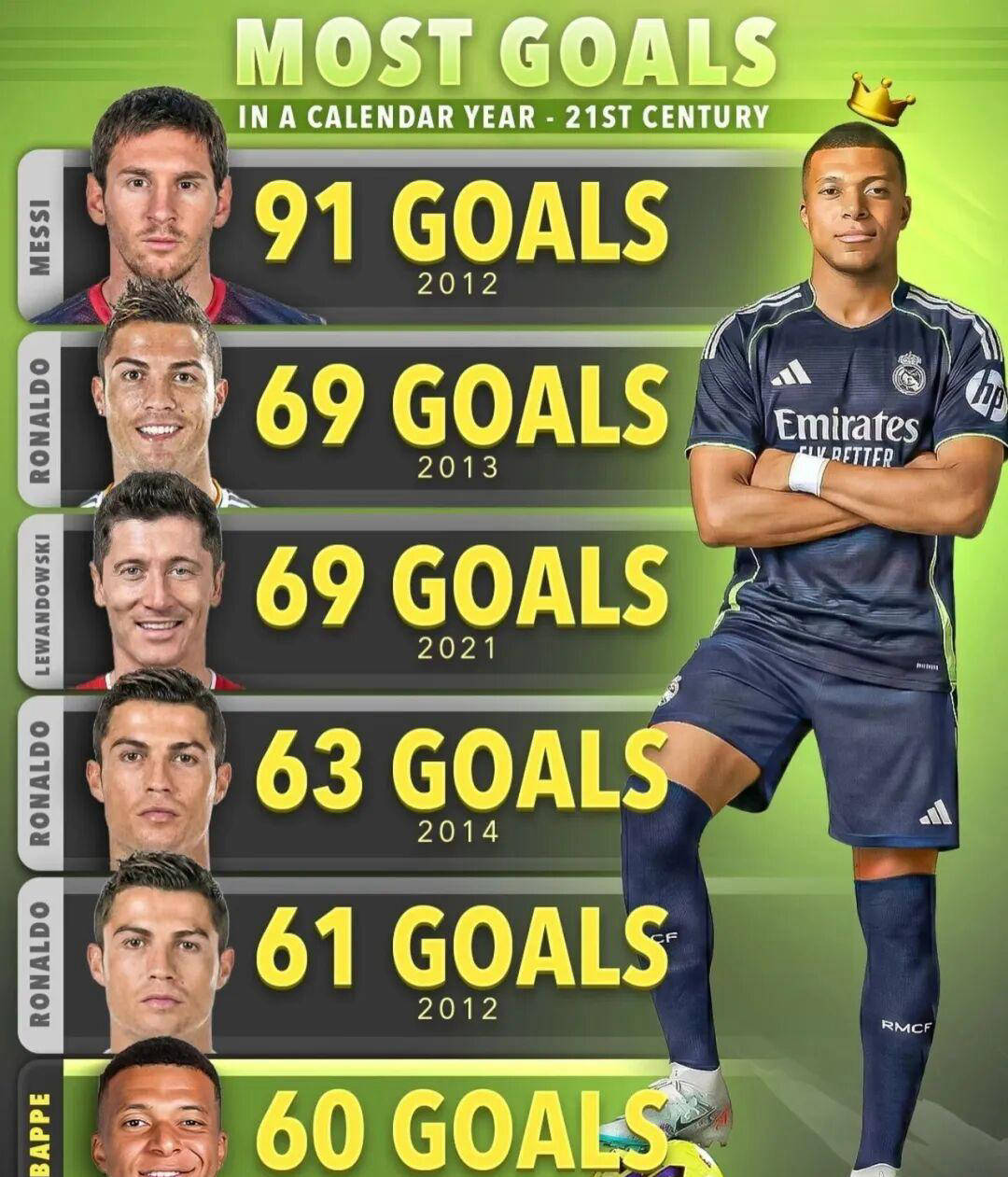 当然,这里的“69球”不仅属于C罗,莱万多夫斯基在2021年同样刷出了69球的纪录,不过在这个榜单中,排在C罗和莱万之后的又是C罗本人,他曾在2014年攻入63球,2012年进61球,显示了这两位巨星的一贯稳定。时至今日,当莱万在2021年首度挑战梅罗统治的进球王座时,曾引发轰动;而四年后,新的年轻势力姆巴佩正崛起,势必掀起新一轮风暴。未来一个月将见证姆巴佩再次凌厉冲击的精彩表现,有理由相信,他完全具备颠覆现有格局、成为新的传奇人物的潜力。这注定是一段令人激动的历史时刻。